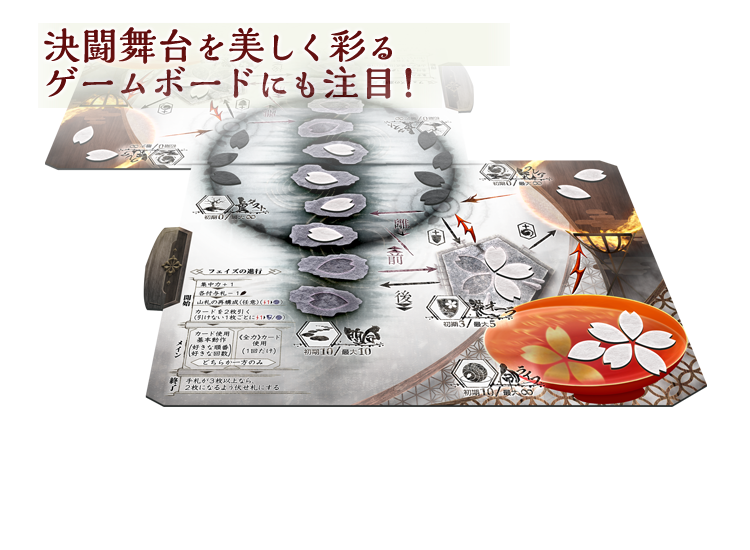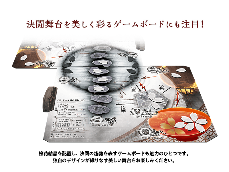 桜花結晶を配置し、決闘の趨勢を表すゲームボードも本作アナログゲーム版の魅力の一つです。独自のデザインが織りなす美しい舞台をお楽しみください。